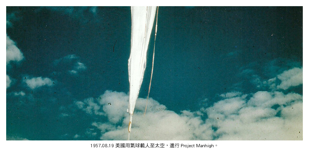 而美國太空小組自1955年開始,以老式的氣球,載人至太空高度,從事代號Project Manhigh的計畫,並於1957年6月2日、8月19日及1958年10月8日,三度派飛行員及航醫,身穿壓力衣,利用200呎直徑的氦氣球,將座艙拉升至近十萬英呎的高度,所謂的太空邊緣,以探測此種高度對人的影響。